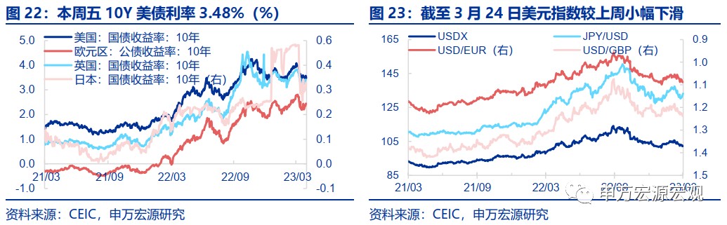 本週 10Y 美債利率、全球原油價格均較上週回升,布倫特油價已經回升至接近 80 美元/桶,10Y 美債利率也升至 3.5% 左右,脱離 3.3% 的低位,兩者其實反映的是市場對於金融風險的擔憂正在緩和。在市場恐慌情緒緩和下,本週市場對於美聯儲後續降息的時點預期也從 7 月推後到了 9 月,我們認為,鑑於目前金融風險演變為系統性風險的概率並不大,潛在的信用收縮對經濟的影響可能有所滯後,以及實體通脹風險仍然嚴重,美聯儲年內降息的概率是不大的。在這一假設下,我國貨幣政策操作外部約束可能不會大幅放鬆,但我國出口在美國超額儲蓄支持下或仍可獲得較好表現,從而支持人民幣年末回升至 6.6-6.7。