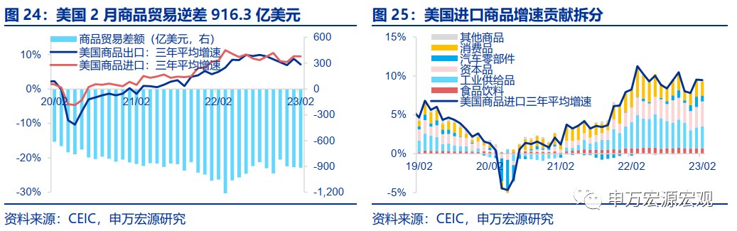 全球貿易:美國 2 月商品出口三年平均增速回落至 7.1%,進口增速維持 9.5%,貿易逆差小幅升至 916.3 億美元。與上月相比,汽車零部件與消費品進口下滑明顯,資本品進口增速提升。