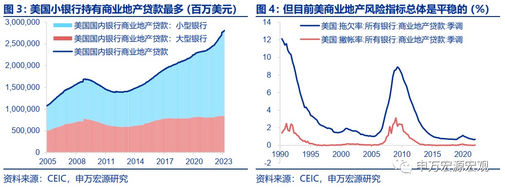 美國商業地產行業引發系統性風險的概率目前來看也不大。近期市場對於美國商業地產行業的擔憂,其實也衍生於市場對於美國中小銀行的擔憂,一方面,美國居民部分出行活動並未回到疫情前的水平,辦公室空置率較高,商業地產運營困難。另一方面,美國小銀行目前持有更多的商業地產貸款,若中小銀行面對存款緊張的情況選擇收緊商業地產融資,償付風險的提升可能引發商業地產貸款及相關衍生品出現連鎖風險,但從目前來看,美國銀行商業地產不良指標仍然健康,處於歷史低位,而且商業地產貸款佔美國小銀行資產比重其實相較 08 年金融危機之前是遠遠更低的,那麼出現美國銀行體系系統性風險概率也就不高了。