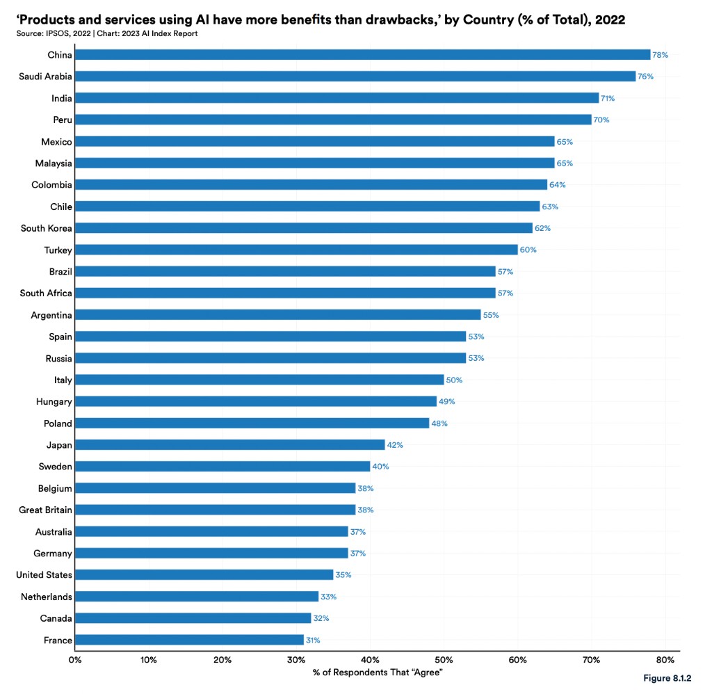 在 2022 年 IPSOS 的調查中,78% 的中國受訪者(在接受調查的國家中比例最高)同意 “使用人工智能的產品和服務的好處多於壞處” 的觀點。其次,沙特阿拉伯(76%)和印度(71%)的受訪者認為人工智能產品 “利大於弊”。只有 35% 的美國受訪者(在被調查國家中比例最低)同意這一説法。