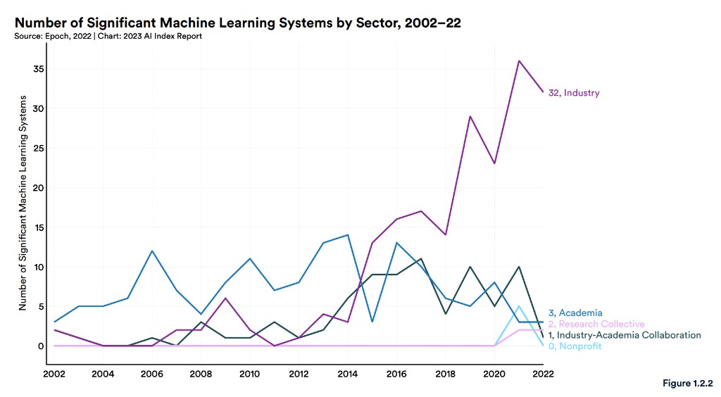 2014 年之前,學術界在開發先進的人工智能系統方面處於領先地位。從那以後,工業界便開始領先。2022 年,工業界研發了 32 個重要的機器學習模型,而學術界只生產了 3 個。