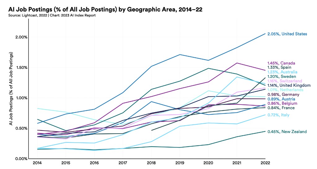 在美國每個使用數據的部門中(農業、林業、漁業和狩獵業除外),與人工智能相關的工作崗位的數量平均從 2021 年的 1.7% 增加到 2022 年的 1.9%。美國的僱主正越來越多地尋找掌握人工智能相關技能的工人。