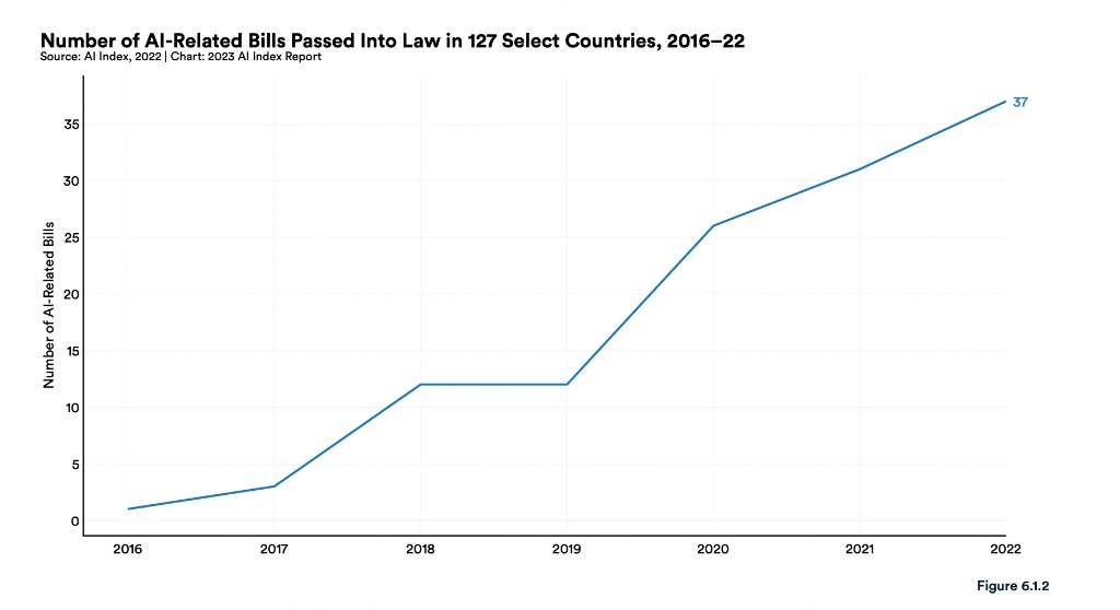 AI Index 對 127 個國家的立法記錄的分析顯示,包含 “人工智能” 的法案數量,從 2016 年的僅 1 個增長到 2022 年的 37 個。