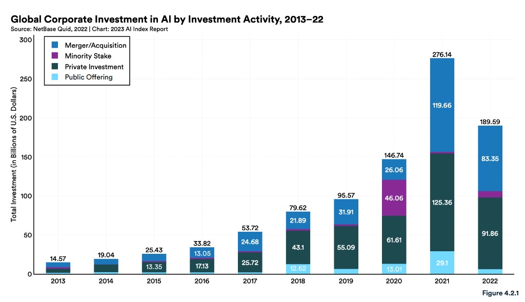 不過,在過去 10 年中,人工智能投資一直在攀升,2022 年人工智能的私人投資規模是 2013 年的 18 倍。