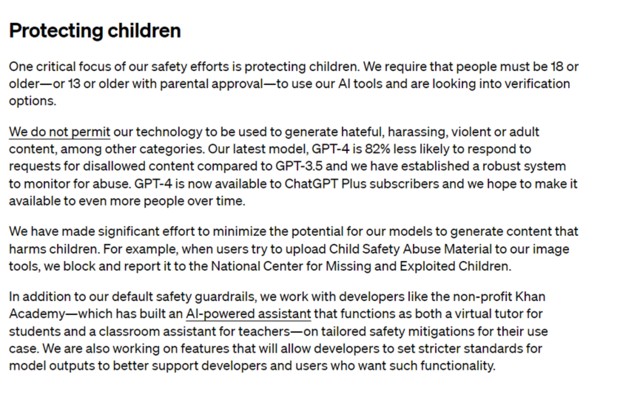 保護兒童的安全一直是 Open AI 的重點工作。Open AI 要求人們必須年滿 18 歲,或在父母同意的情況下年滿 13 歲才能使用 Open AI 的產品。Open AI 正在研究驗證選項。