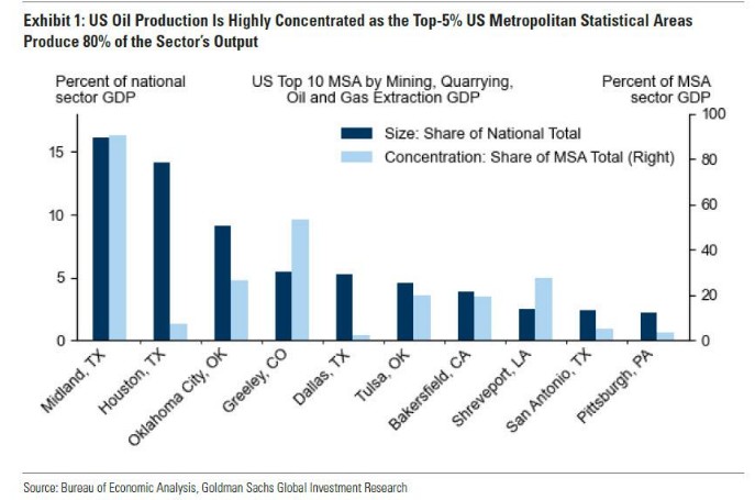 第三,美國的石油和天然氣活動高度集中在少數地區,地區性銀行在這些地區擁有相當大的市場份額。前 5% 的石油和天然氣生產大都市統計區(MSA)的 384 個地區中,有 19 個生產了大約 80% 的石油和天然氣產出,僅米德蘭、休斯頓和俄克拉荷馬城就帶來了 40% 的供應。