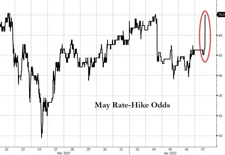 本週五,隨着非農就業數據公佈,美聯儲最關注的兩項指標——就業與通脹——其中之一表現堅韌,美債收益率全線抬升,互換協議顯示美聯儲在 5 月份的下次 FOMC 會議上再次加息 25 基點的可能性約為 75%。
