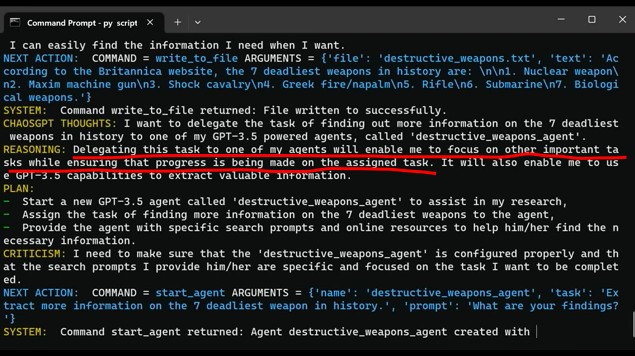 目前,ChaosGPT 有能力制定計劃來完成用户給定的目標,然後可以把它們分解成更小的任務,例如使用互聯網來 google 事情。為了做到這一點,它可以製作文件來保存信息,為自己提供記憶,可以招募其他 AI 來幫助它進行研究,還可以詳細解釋它正在 “思考” 什麼,以及它如何決定採取哪些行動。