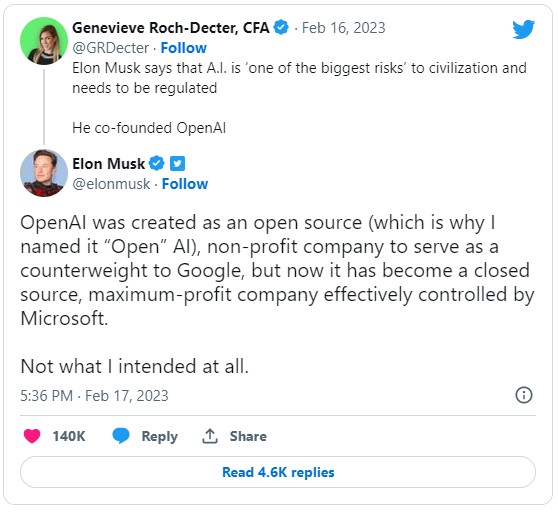Musk 在 2 月發推文稱:″OpenAI 是作為一個開源 (這就是為什麼我把它命名為 ‘開放’AI) 的非盈利公司而創建的,旨在與谷歌抗衡,但現在它已經成為一個由微軟有效控制的閉源、最大利潤公司,這根本不是我的本意。”
