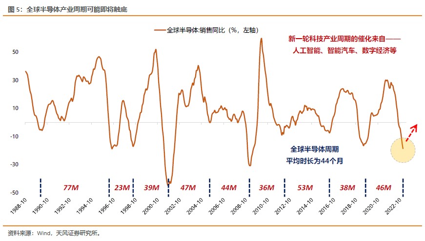 天風證券指出,全球半導體銷售額同比增速已經由 2021 年 8 月的高點 29.7% 持續回落至今年 1 月的-18.5%,當前在人工智能科技浪潮催化下,半導體週期可能醖釀新一輪復甦週期。