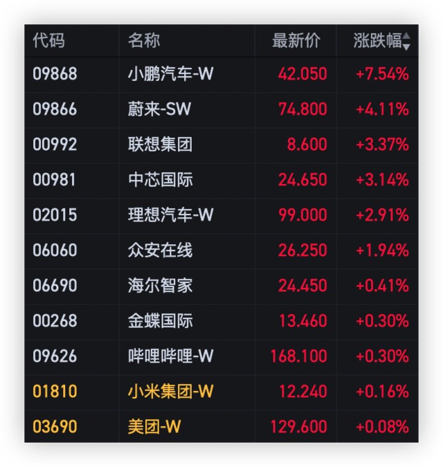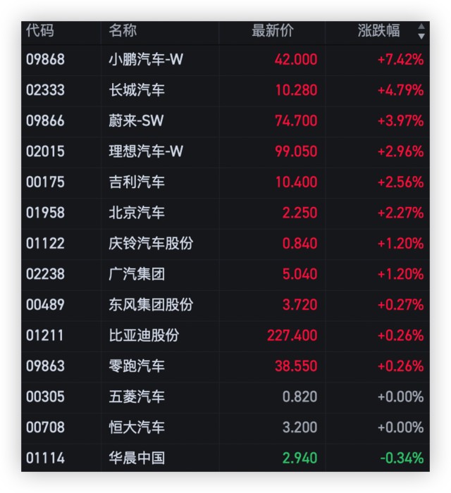 小鵬漲超 7%,長城漲近 5%,蔚來漲近 4%,理想汽車、吉利汽車等跟漲。