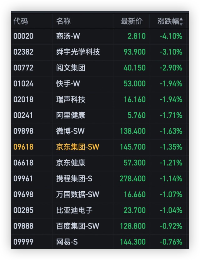 中芯國際大漲 3%,小米、美團、騰訊、阿里均在 1% 內窄幅震盪,京東跌超 1%,商湯跌超 4%,快手跌近 2%。
