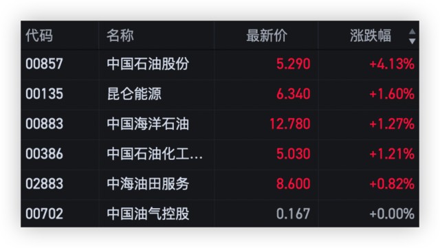 中石油漲超 4%,崑崙能源、中海油、中石化等跟漲。