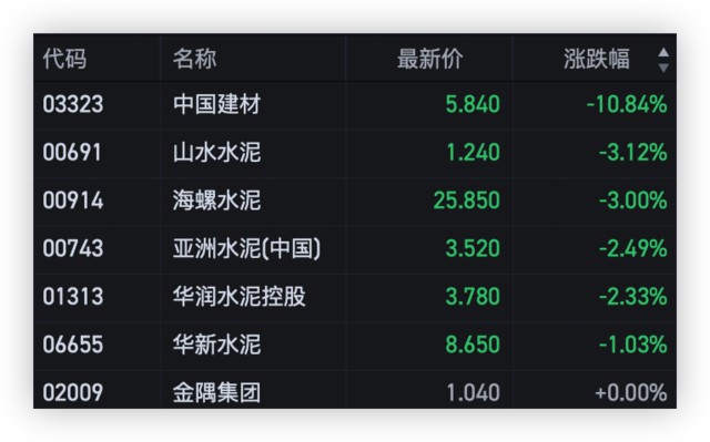 中國建材大跌近 11%,山水水泥、海螺水泥跌 3%,亞洲水泥等跟跌。