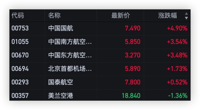 國航漲近 5%,南航、東航漲超 3%,首都機場、國泰航空跟漲。