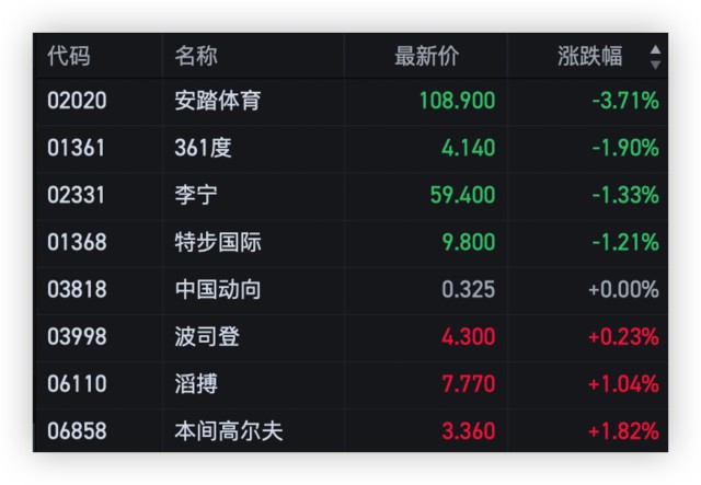 安踏跌超 3%,361 度跌近 2%,李寧、特步跌超 3%。