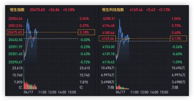 4 月 17 日週一,港股早盤高開低走,目前維持橫盤震盪。截至發稿,恒指漲 0.18%,恒生科技指數漲 0.13%,此前一度雙雙陷入跌勢。
