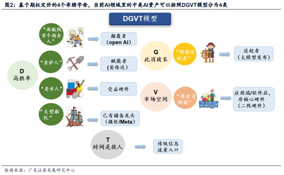 4 月 19 日,廣發證券分析師吳迪、戴康在最新研報《DGVT 框架看 AI 中美映射——“AI 奇點時刻” 系列(七)》中表示,當前人工智能 AI 領域成長股的定價服從看漲期權的定價模式。目前 AI 類資產具有高成長性,因此用期權定價中的 Delta、Gamma、Vega 和 Theta 4 個希臘字母來比喻不同特徵資產,並提出了認為值得配置的細分賽道。