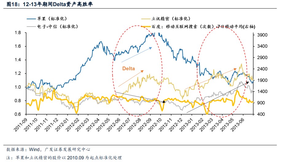 2012 年年初前後 iPhone 4S 發佈後移動互聯網熱度升高後回落,雖 Vega 應用/非核心硬件走弱,但基於中美映射下的 Delta 資產勝率高,比如立訊精密。