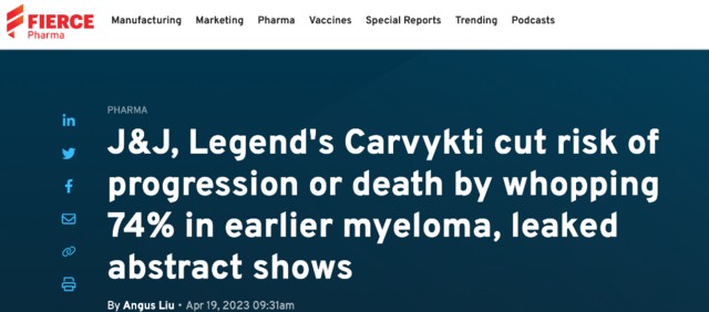 根據 Fierce Pharma 獲得的提前泄露數據,與此前嘗試過 1-3 線的 MM 標準治療相比,患者接受 Carvykti 治療的患者的疾病進展或死亡風險下降高達 74%。