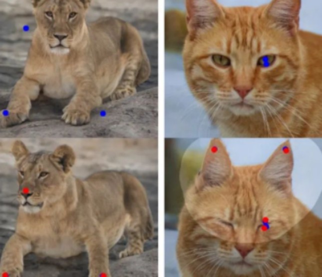 用户只需要對照片設置幾個操作點(紅點)、目標點(藍點),然後進行拖拽,就可以生成新的圖像。