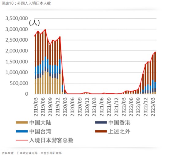 疫后红利的主要体现之一也反映在入境日本的外国游客人数。日本政府公布的入境外国游客数据显示,目前已经恢复至 2019 年同期的 7 成左右的程度,然而其中来自中国大陆的观光人数目前还占比有限,未来或成为新的增长点。