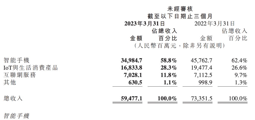 此外,互聯網服務分部收入由 2022 年第一季度的人民幣 71 億元減少 1.2% 至 2023 年第一季度的人民幣 70 億元,主要是由於小米金融科技業務及廣告業務收入減少,惟部分被遊戲業務收入增加所抵銷。