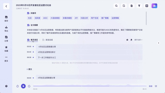 跟以往的錄音轉寫工具不同,它不只是能把錄音、視頻轉成文字這麼簡單。能一鍵總結全文不説,總結不同發言人觀點也能做到: