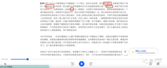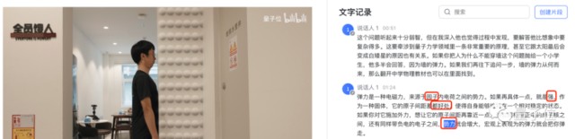 我們用同一段視頻在飛書妙記上也進行了測試。基本問題也不大,但相比聽悟,飛書多了兩處錯誤,把其中一處 “原子” 寫成了 “園子”,把 “斥力” 聽成了 “勢力”。