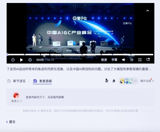 測試視頻是一段 40 分鐘的圓桌討論,主題是中國 AIGC 新機遇。參與圓桌討論的共有 5 人。
