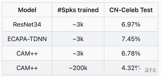 在行業主流的中英文測試集 VoxCeleb 和 CN-Celeb 上,CAM++ 均刷新了最優準確率。