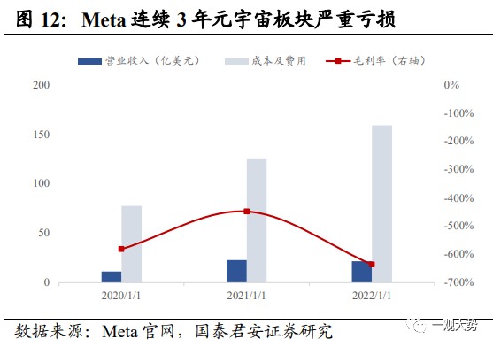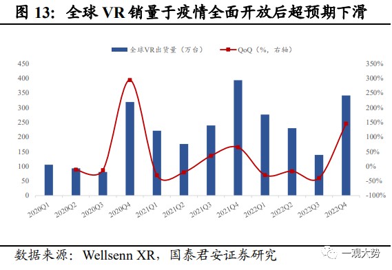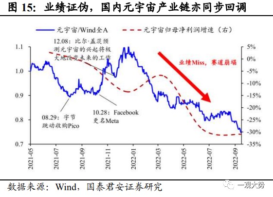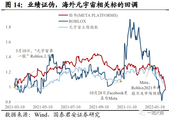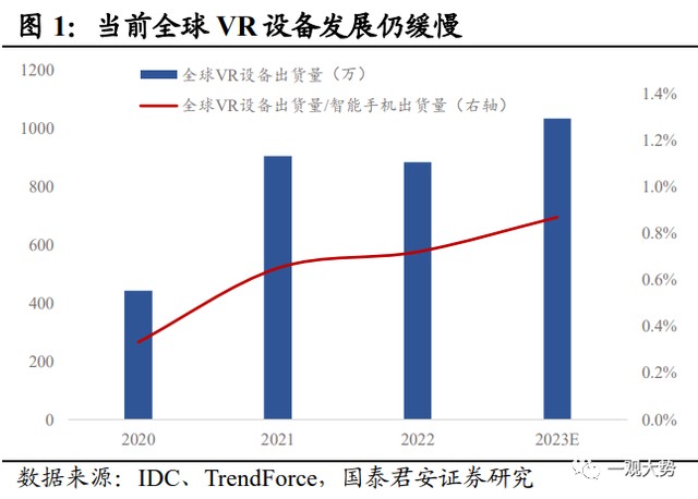 2021 年元宇宙主题行情:始于巨头入局和 VR 设备出货超预期,止于业绩表现的证伪。2021 年 10 月,以 Facebook 押注元宇宙为契机,市场掀起元宇宙主题行情,短时间内国内外多家互联网科技巨头相继宣布入局。国外方面,微软推出 Mesh for Team,切入元宇宙办公赛道,Google 计划重组 Google Labs,专注于研发包括 AR/VR 等具备长期发展潜力的设备;国内方面,字节相继投资光舟半导体、众趣科技、梦途科技,阿里巴巴达摩院宣布增设 XR 实验室。与此同时,疫情期间电子娱乐需求激增,VR 头显设备全球出货量超市场预期,21 年 Q3-Q4 全球出货量增速超 60%,连续两个季度保持稳定高速增长态势。巨头的纷纷入局以及设备端销售超预期之下,元宇宙行情开启。而后续缺乏业绩验证也导致了行情仅停留在概念阶段,主题行情持续时间较短,触顶后热潮随即退却。其一,2022 年 2 月 Meta 和 Roblox 相继披露年报,其中 Meta 元宇宙业务板块连续两年亏损严重,业绩表现不及预期挫及市场信心,引发投资者对元宇宙前景的担忧,年报公布当日,二者股价下跌超 20%。其二,2022 年疫情全面放开后,“宅经济” 概念退潮,全球 VR 设备出货量大幅下滑超预期。整体来看,概念超前、缺乏现象级硬件支撑、生态不成熟等因素是行情无法向业绩验证过渡的重要原因。