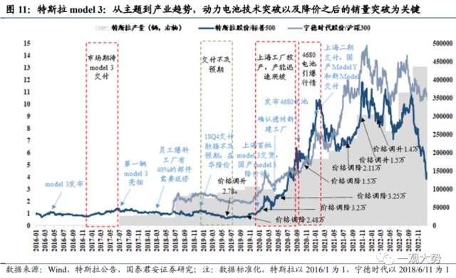 ●特斯拉 model 3:从主题到产业趋势,动力电池技术突破以及降价之后的销量突破为关键。尽管 model3 早在 2016 年 4 月即发布,第一辆 model 3 早在 2017 年即亮相,但特斯拉股价反应平淡,真正的行情爆发在 2020-2021 年,核心在于动力电池技术的突破以及降价之后的销量突破。2020 年动力电池技术的突破带动了新能源车产品力的抬升,此时特斯拉股价开始明显拔升,可以发现宁德时代和特斯拉股价亦同步表现。而后续凭借各国新能源政策补贴、特斯拉在中国建厂量产优势和对零部件厂商议价能力增强,特斯拉成本大幅下移,在 2020 和 2021 年多次降价,消费者接受度逐步提升,凭借 model 3 的高性价比,公司产品快速放量,股价相应获得了明显的超额收益。
