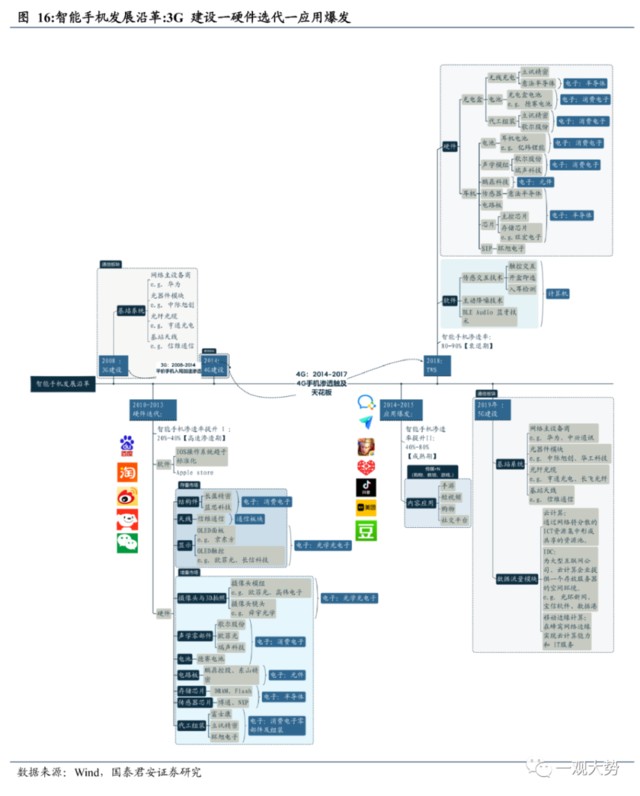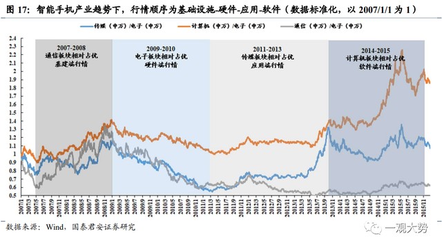 智能手机发展沿着 3G 建设→硬件迭代→应用爆发,行情顺序同步表现为基础设施端 - 硬件端 - 应用端 - 软件端。2008 年,3G 等基础设施建设快速完善,随后 iphone3G-iphone4-iphone4s 等系列问世,A 股苹果供应链相关公司受益,此后 2012 年前后小米、华为荣耀等销量大增,国产千元机时刻来临,手机出货量迅速增加,硬件端加速迭代,带动相应消费电子板块行情。而伴随着硬件性能的成熟以及智能手机的加速渗透,下,微信、支付宝等爆款 APP 出现带来内容端的持续爆发,手游、短视频、社交、购物等内容应用迎来爆发式增长,此时传媒和计算机板块开始迎来超额收益。