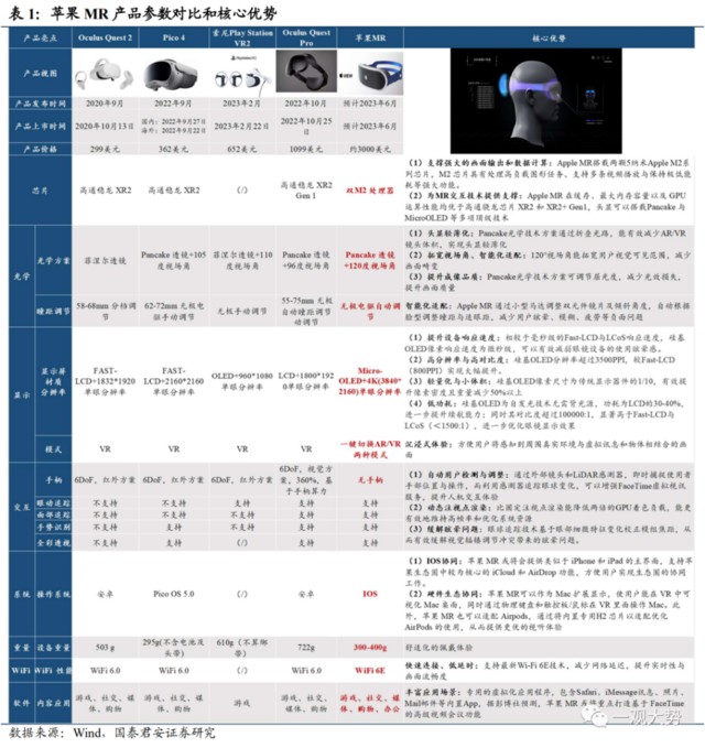 ▶苹果 MR:创新直击痛点,一个可能的划时代产品。苹果 MR 创新突破,直击当前头戴式设备眩晕感、厚重感和内容不足三大核心痛点:Micro OLED 缓解眩晕,搭配 pancake 光学技术实现轻量化,120 度广角拓宽视觉范围,M2 芯片搭载、智能交互创新和 IOS 协同生态及庞大的用户基础有望突破内容阻碍。苹果 MR 在增强现实、动作追踪、分辨率等技术参数上领先竞品,有望成为头显领域从 0-1 的划时代产品。