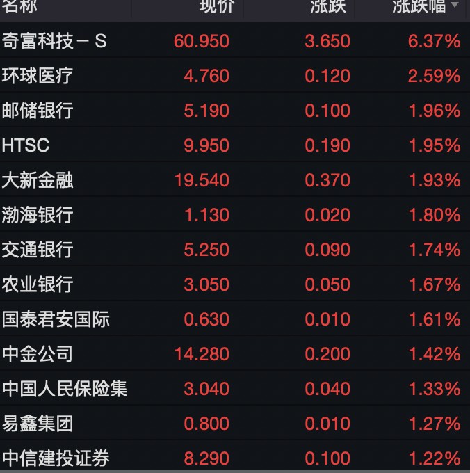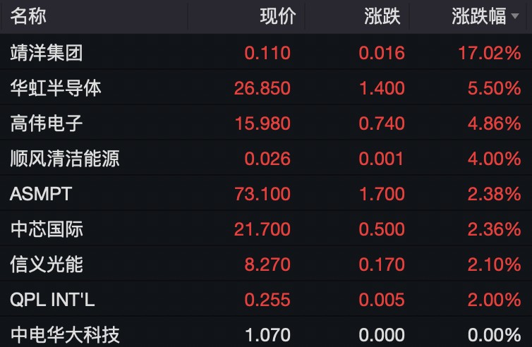 靖洋集團漲超 17%,蘋果概念股高偉電子反彈逾 5%,中芯國際收漲 2.36%。