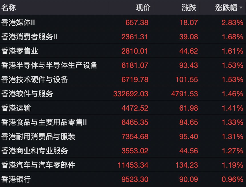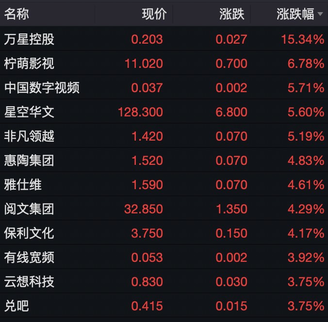 傳媒開盤後持續走高,連續第五日收漲,萬星控股漲逾 15%,檸檬影視漲近 7%,中國數字視頻、星空華文漲逾 5%,閲文集團、保利文化、雲想科技等漲幅居前。