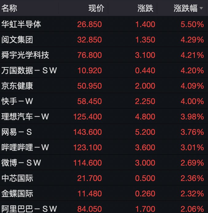 科技股大部份飄紅,華虹半導體漲 5.5%,閲文集團、舜宇光學、快手漲逾 4%,理想汽車、網易、嗶哩嗶哩漲超 3%。