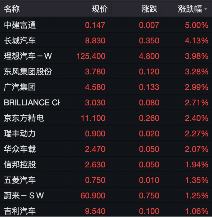 中建富通漲 5%,長城汽車連續第二日反彈,漲逾 4%,理想汽車、東風集團漲逾 3%,廣汽集團漲近 3%,五菱汽車、蔚來、吉利汽車漲逾 1%,比亞迪收漲 0.32%。
