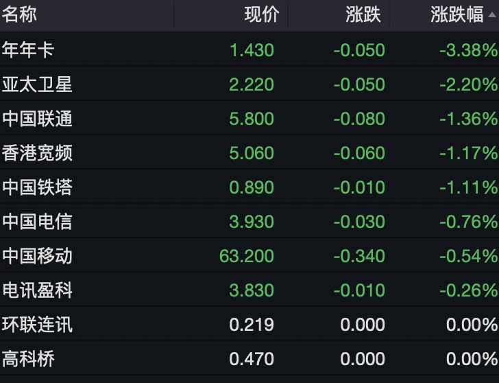 中國聯通跌 1.36%,中國電信跌 0.76%,中國移動跌約 0.5%。