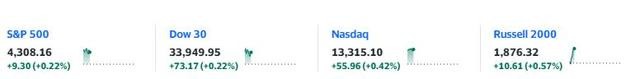 開盤近一小時,道指一度漲百點,標普 500 指數重返 4300 點上方,上週自去年 8 月來首次升破這一關口,收盤或刷新去年 4 月來的一年多最高。納指和羅素小盤股漲幅相對居前。