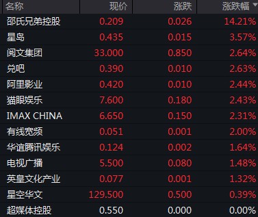 邵氏兄弟控股漲逾 14%,閲文集團、阿里影業、貓眼娛樂漲逾 2%。