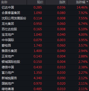 億達中國漲超 14%,合景泰富漲近 8%,龍光集團漲逾 6%,寶龍地產、碧桂園、雅居樂等漲幅居前。