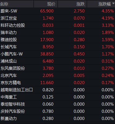 蔚來領漲,長城汽車、小鵬汽車漲超 1%,東風集團、北京汽車微漲,理想汽車跌超 1.8%,比亞迪跌約 0.3%。