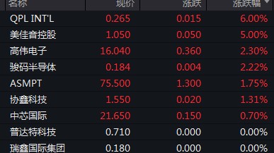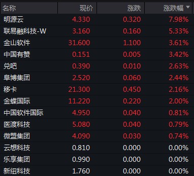 閲文集團、金山軟件漲逾 4%,蔚來漲超 3%,商湯、中芯國際漲逾 2%,聯想、百度、騰訊漲逾 1%。
