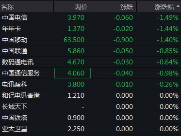 中國電信、中國移動跌逾 1%,中國聯通跌約 0.8%。
