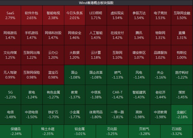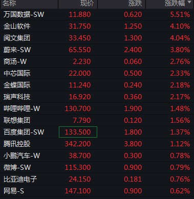 萬國數據漲超 5%、閲文集團、金山軟件漲逾 4%,蔚來漲超 3%,商湯、中芯國際漲逾 2%,聯想、百度、騰訊漲逾 1%。
