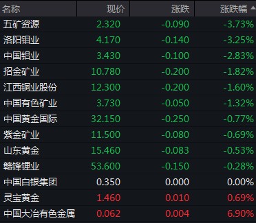 五礦資源、洛陽鉬業跌超 3%,中國鋁業跌約 2.8%。