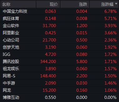 遊戲概念股拉漲,中國寶力科技漲逾 6%,瘋狂體育漲逾 5%。