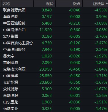 中石油、中海油跌超 3%,中石化跌逾 2%,中國神華、兗礦能源、兗煤澳大利亞跌超 1%。